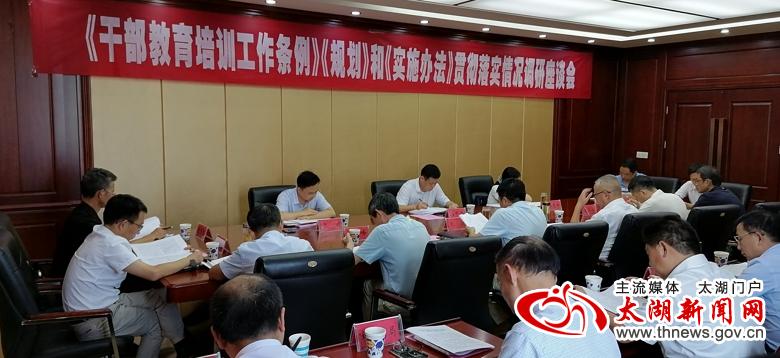 8月18日,省委组织部干部教育处副处长汤中营率队来我县就《干部教育培训工作条例》《规划》和《实施办法》贯彻落实情况进行评估调研。市委组织部副部长、市委非公工委书记桂锐主持座谈会。