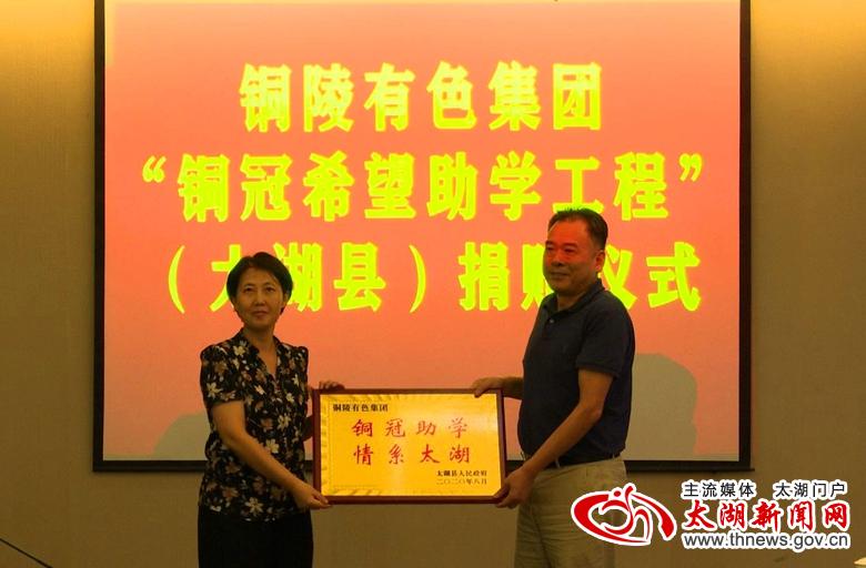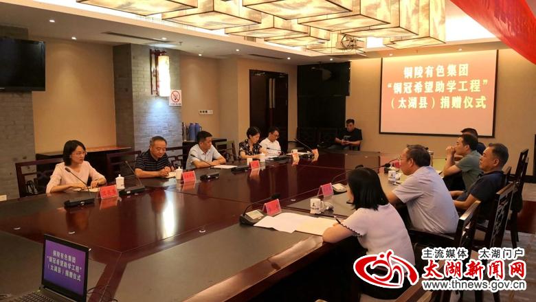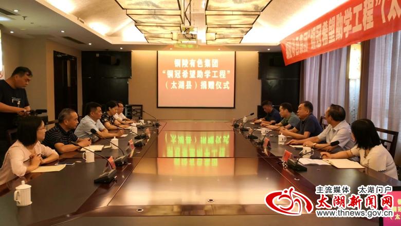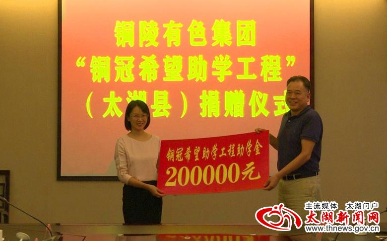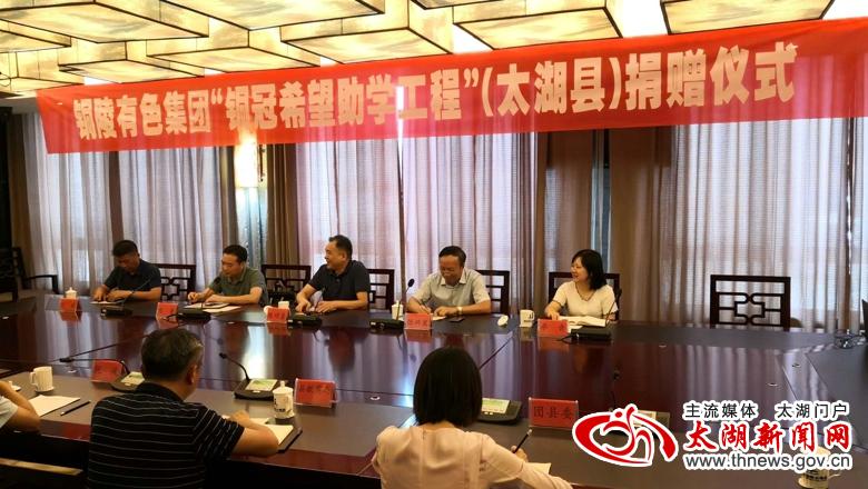 8月24日,铜陵有色集团党委副书记、工会主席陈明勇一行来我县开展“铜冠希望助学工程”捐资助学活动。县委常委、组织部长、统战部长阮波,副县长李传萍以及团县委、县教育局、扶贫办主要负责人出席捐赠仪式。