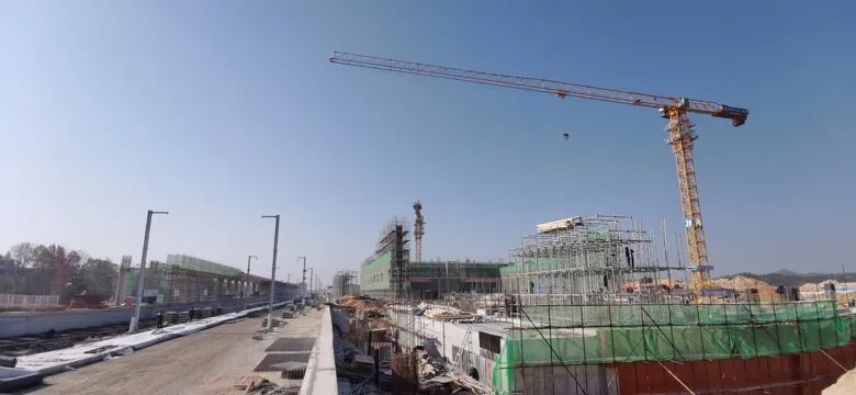 太湖南站位于新仓镇沙坝村,距离县城约7.8公里,总建筑面积为9954平方米,主体站房功能布局分为两层,一层进站层,站房一侧设有售票厅、办公及设备用房,另一侧设有设备用房,中间设置候车空间;二层平面标高6.600M,两端分别设有办公用房及机电设备用房。该项目于今年4月开始动工建设,到目前,地下部分已全部完工,站房主体结构完成60%,站台雨棚结构完成50%。今年由于疫情和夏季雨水多等原因,高铁站建设的工期因此受到影响。为确保按期完成,施工单位利用当前晴好天气,合理调配人员和施工时间,开足马力加快工程建设。