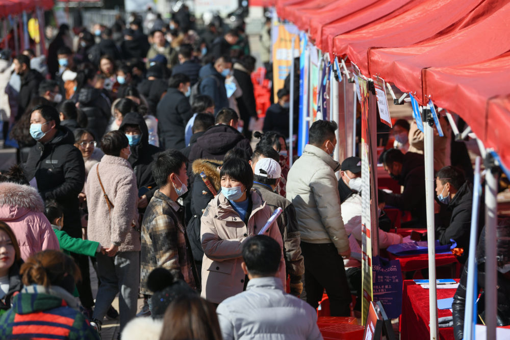 1月29日,阜阳市颍泉区在青颍公园东门广场举行专场招聘会。(庞诚 摄)