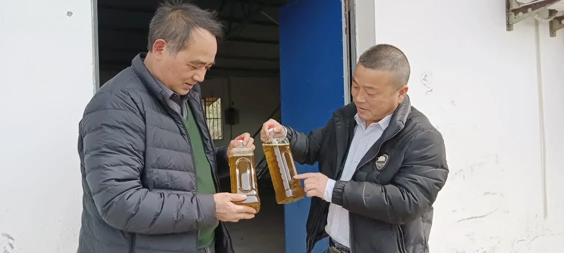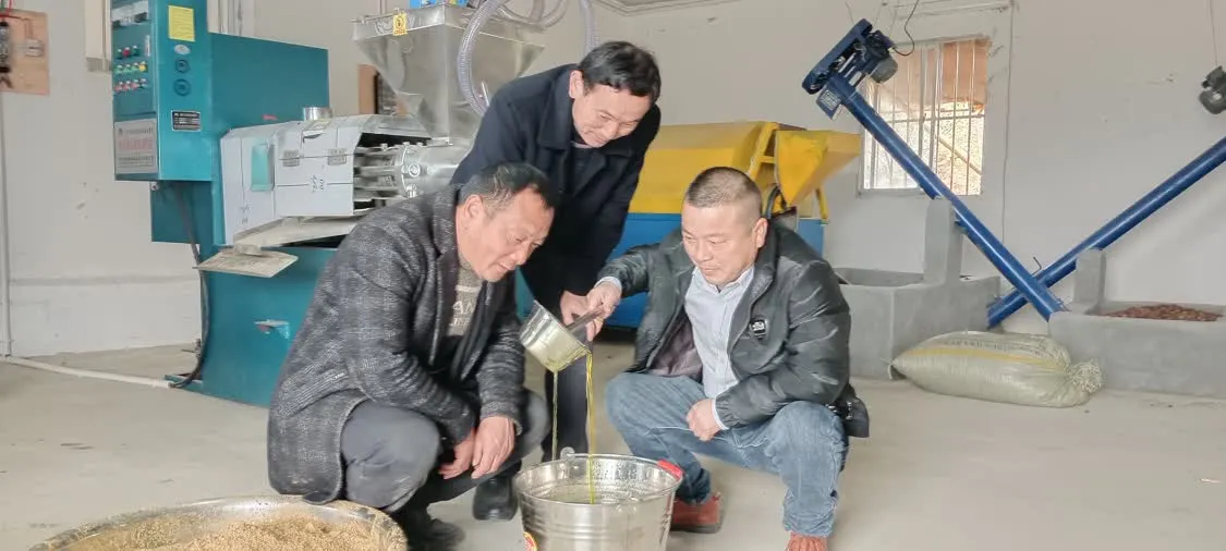 近日,在安徽太湖县新仓镇牌楼油茶基地油茶加工设备的车间,村党总支委员严旺桂和乡村振兴驻村工作队成员正跟在技术人员后面当“学徒”,熟悉新购置茶油加工设备的操作技术,苦学“炼油术”。车间内,人员分工明确,“炒、碾、蒸、压、炼”系列流程操作顺畅有序。不时间,一桶桶色泽金黄的茶油随机而出,机器轰鸣的声响都难掩住大伙开心的笑声,村里的油茶终于实施了自种、自采、自加工。