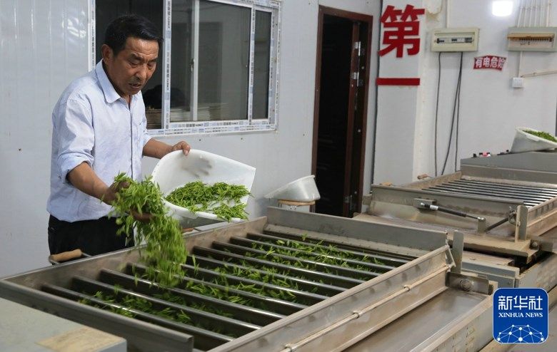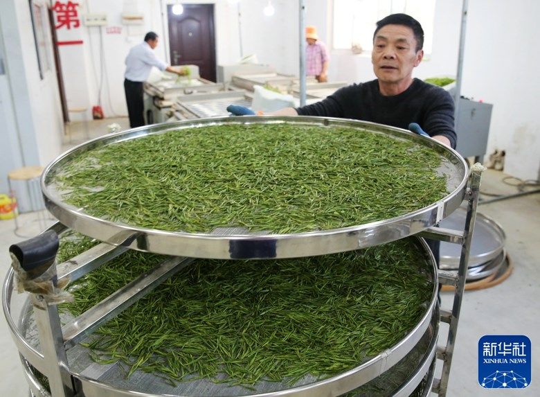 在制茶车间,新鲜茶叶经过分级挑选、摊青、杀青、理条、揉捻、摊凉、烘干等工序,加工成春茶。