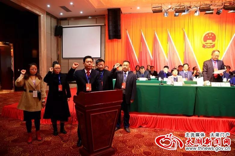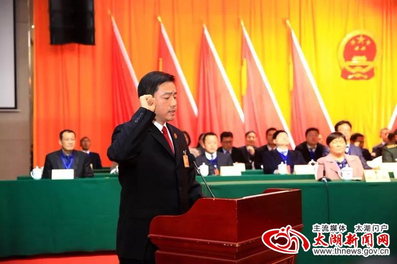 在热烈的掌声中,新当选的太湖县人大常委会副主任张超宜、太湖县人民法院院长陈浩及太湖县十六届人民代表大会社会建设委员会委员庄严地向宪法宣誓。