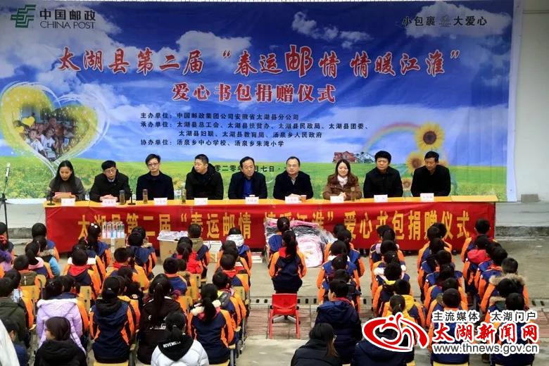 1月7日下午,我县第二届“春运邮情 情暖江淮”爱心书包捐赠仪式在汤泉乡朱湾小学举行,为近百名学生送去了书包、书籍、文具等学习用品。
