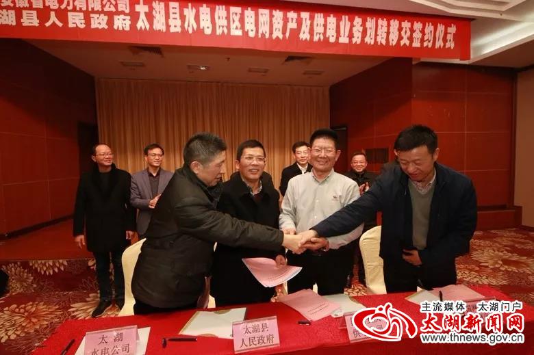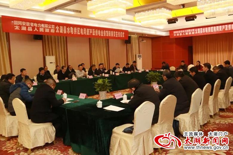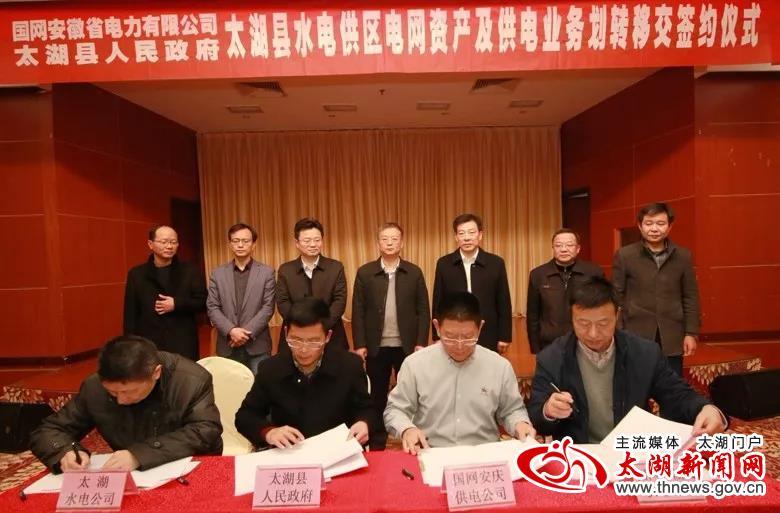 1月3日,国网安徽省电力有限公司与太湖县人民政府“太湖县水电供区电网资产及供电业务划转移交签约仪式”举行。国网安徽省电力有限公司副总工程师洪天炘,市发改委主任张剑,县长朱小兵,副县长彭林等出席签约仪式。标志着我县小水电供区为地方经济发展提供高质量供电服务迈向了新时代。