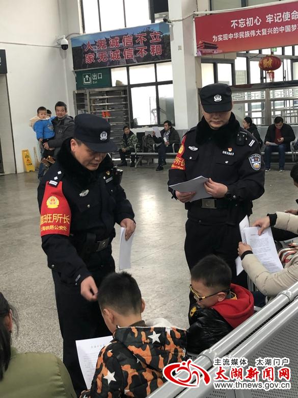 春运时期,往返旅客数量都开始激增,铁路公安既要保障旅客的人身财产安全,又要保证他们平安、方便、温馨出行。太湖火车站派出所提前谋划,周密部署,不仅每日固定警力坚守客运一线,而且通过科学调配将大部分警力安排到现场维护车站乘降秩序。在所有涉及列车的时间内,都有民警在岗维护秩序,加强巡视检查,及时对需要帮助的旅客进行帮助救急。同时,进一步强化安检查危、实名验证工作,对旅客随身携带的行李、票证,严格检查,以确保站、车的绝对安全。