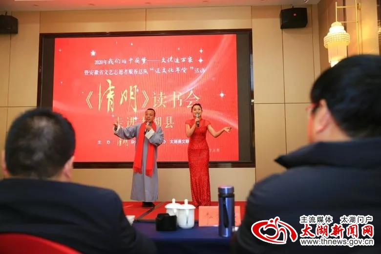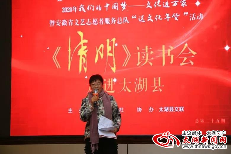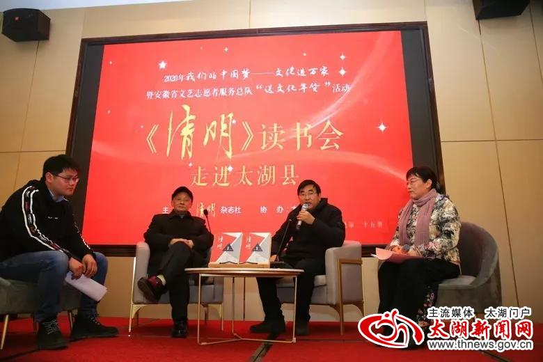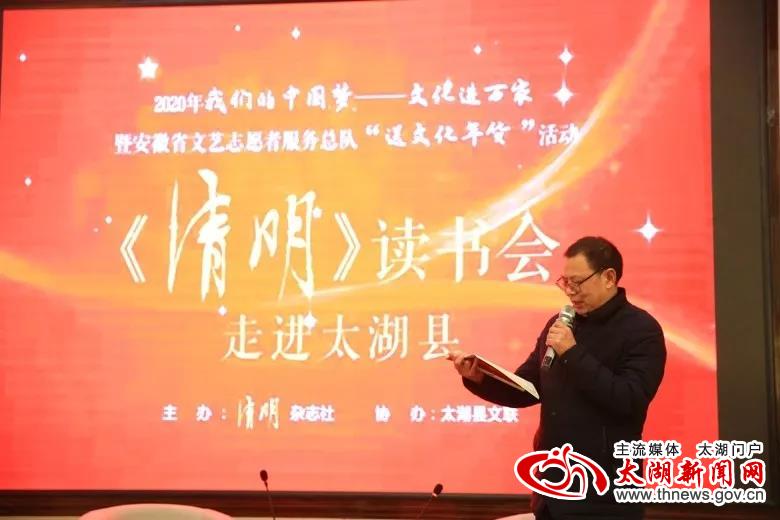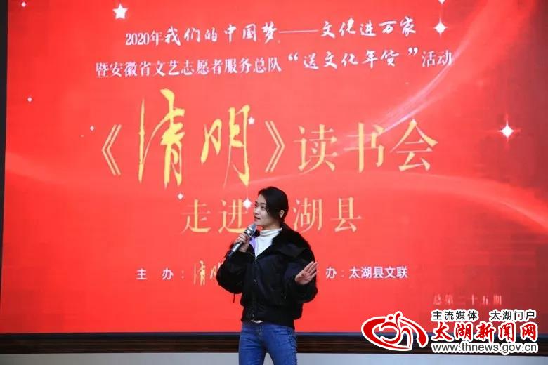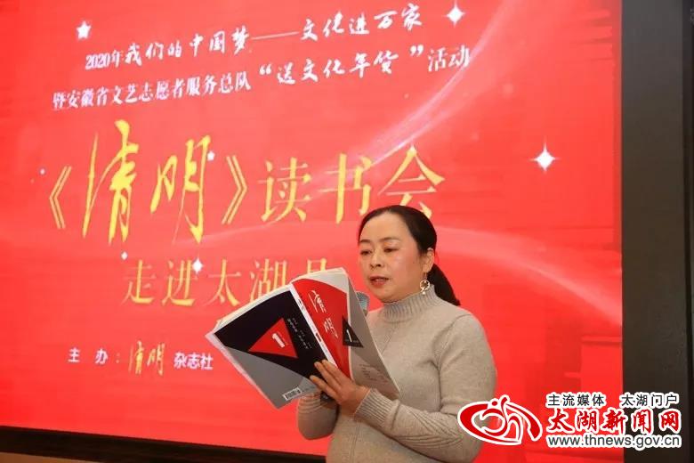 此次活动以“我的中国梦 文化进万家”为主题,在新春佳节来临之际,《清明》杂志社按照安徽省文艺志愿服务总队“送文化年货“活动的总体要求,积极组织作家、编辑深入基层一线,寻找创作素材,与省内外作家共同探讨文学创作的切身感受和文学收获,对进一步推进文学事业的健康发展搭建了良好的创作平台,提供了利好的创作契机。特别是在读书会互动环节中,《清明》杂志执行副主编赵宏兴,著名作家、南京市作协副主席余一鸣,安大文学院博士研究生吴长青等作家同我县文学作者现场解析文学创作秘诀、现场评论文学创作态势、现场提问作答、积极释疑解惑,收获了文学创作的喜悦,达到了读书会的预期效果。我县文艺爱好者还表演了经典的黄梅戏,给读书会营造了轻松活泼的文学氛围。