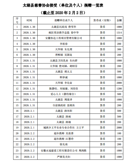 太湖县慈善协会接受(单位及个人)捐赠一览表 (新型冠状病毒感染的肺炎疫情防控期间)