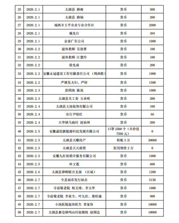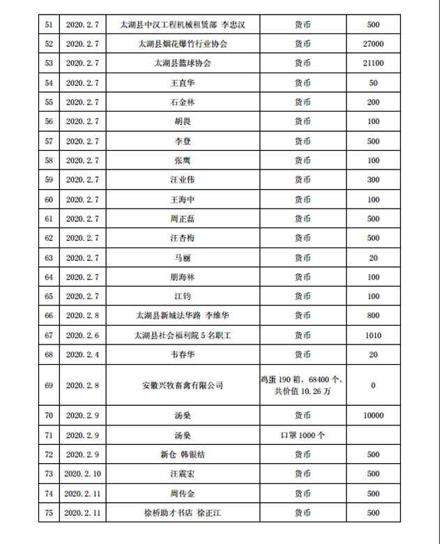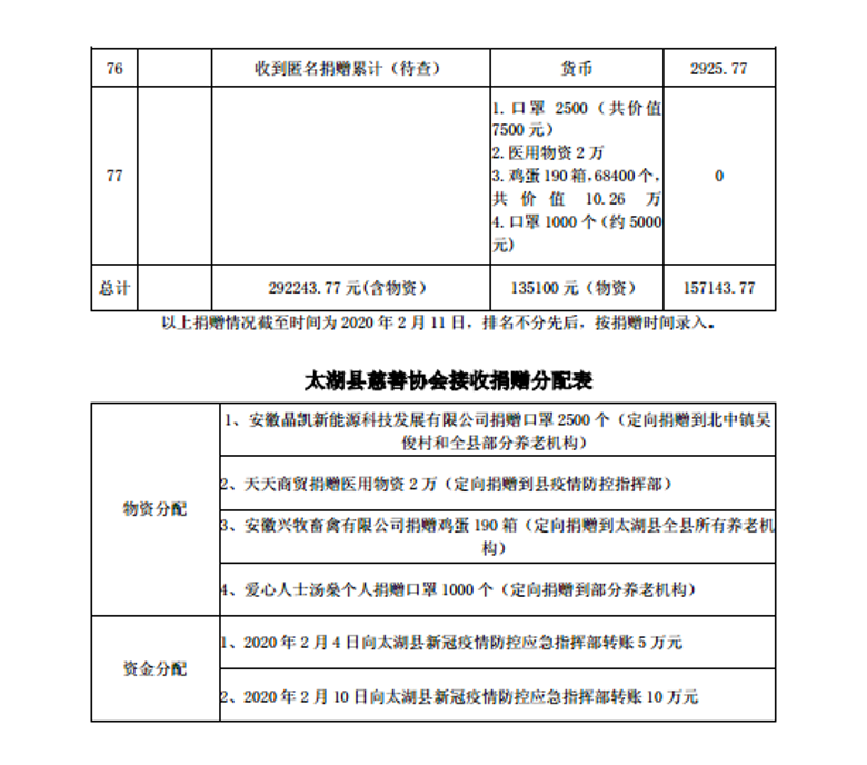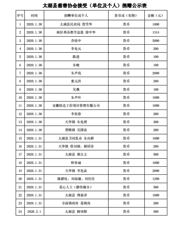 2020年1月30日至2月11日以来,太湖县慈善协会共收到捐赠款物292243.77元(含物资),谨此,太湖县慈善协会向关心、支持我县新冠疫情防控的社会各界爱心人士及爱心单位表示衷心的感谢和崇高的敬意!现将捐赠情况公示如下(排名不分先后):