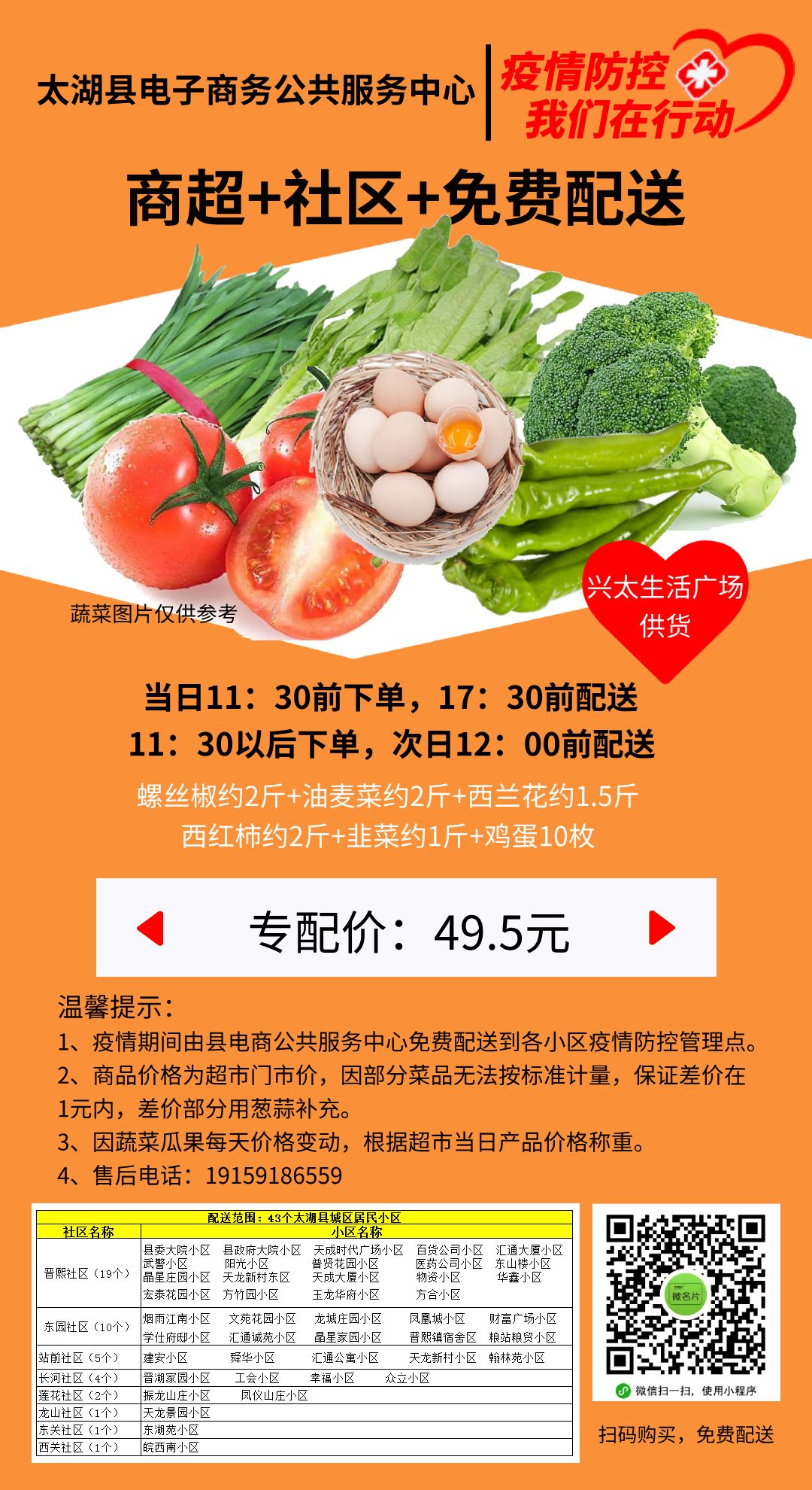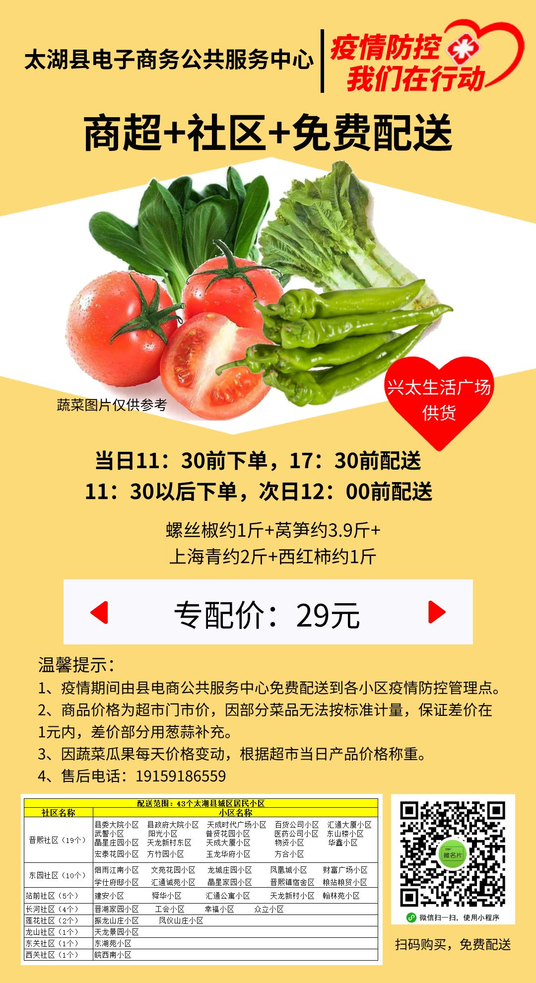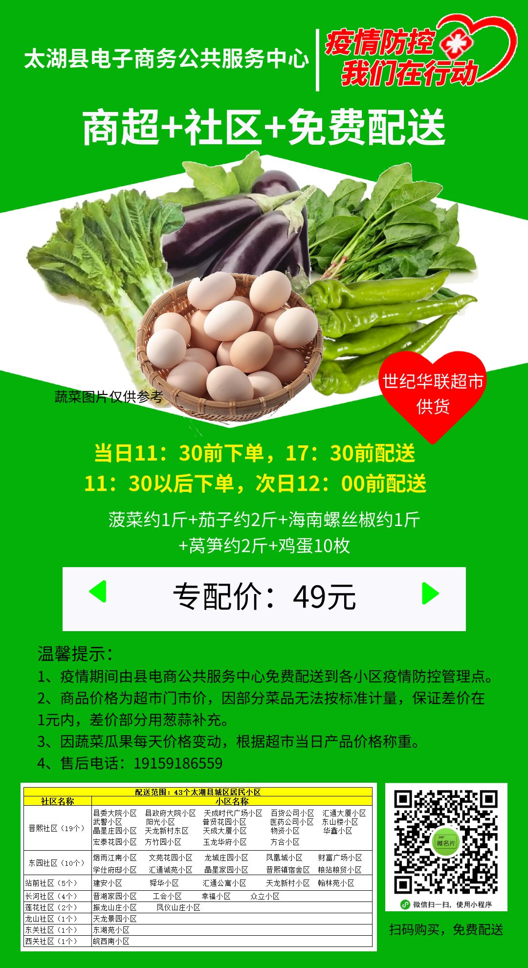 目前,我县小区都实行了封闭式管理,为保障小区居民生活物资的采购需求,减少人员流动,减小交叉感染的风险,太湖县电子商务公共服务中心开展“抗击疫情,电商平台助力生活必需品进社区”免费配送活动。活动依托电商平台优势,整合本地商超资源,推出生活必需品线上采购,并在防疫期间为封闭的居民免费配送。