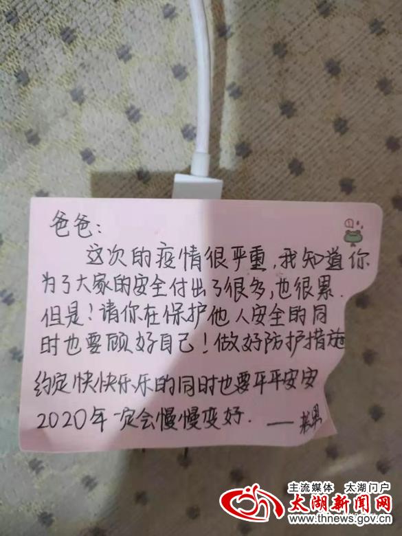 十一点将至,他起身收拾东西准备回家。他很愧疚不能值守得再久一些,因为家里还有个女儿在等着他。说起他女儿,他一脸笑容,立即从怀着掏出手机给我看他女儿写给他的便利贴“爸爸,这次的疫情很严重,我知道你为了大家的安全付出了很多,也很累,但是请你在保护他人安全的同时也要照顾好自己!做好防护措施,约定快快乐乐的同时也要平平安安,2020年一定会慢慢变好——若男”。简单的表述,稚嫩的字迹,饱涵了对爸爸的理解、支持和关心,纸短情长,在这寒冬雪夜,简直是一股暖流,难怪他会迫不及待的拿出来分享。