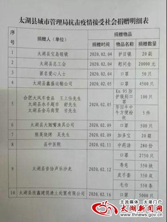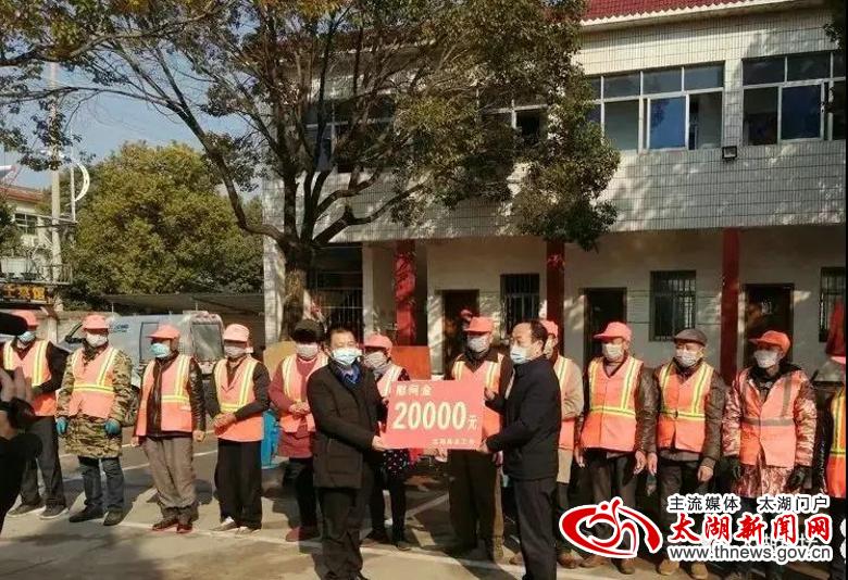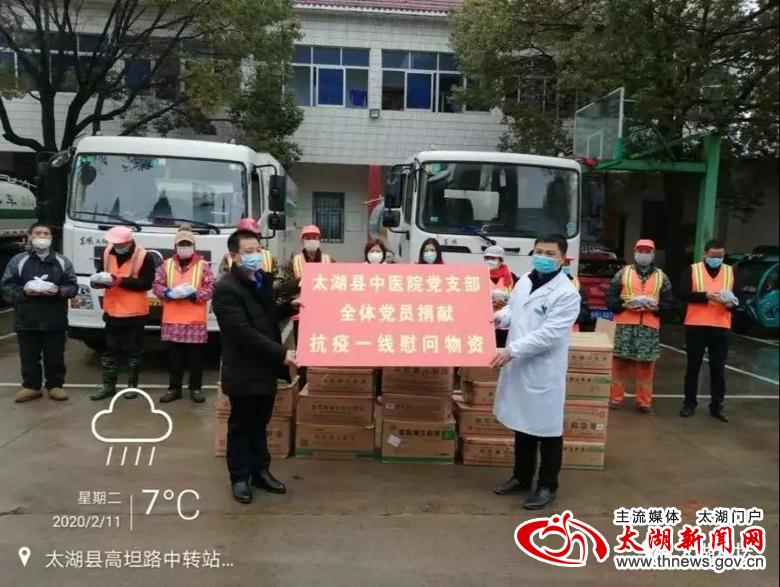 抗击疫情以来,县总工会、县中医院为一线环卫工送上了2万元的慰问金和280份中药汤,县欣鑫建筑渣土处置有限公司、县音协声乐沙龙、县鑫盛运输公司、县宝岛眼镜行、县大翘嘴渔具公司等5家爱心企业和合肥大风车食品王先生、县永丰超市舒先生、县金马商贸甘先生、县熊英烧烤吴先生及1名匿名“好心人”纷纷伸出援手,加入了这场共同战“疫”中,向一线环卫工人捐赠了口罩、手套、护目镜、香皂、毛巾、方便面、加多宝等物资,有效缓解了口罩、手套等防疫物资暂时性紧缺问题。