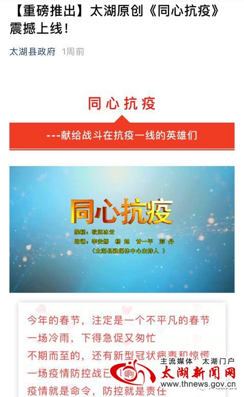 针对如何有效应对和配合全县疫情防控工作,在遵循县委宣传部新闻宣传组的统一调度下,中心积极创新宣传工作方式,把握疫情防控进展,特别策划航拍并在第一时间及时推出疫情防控微视频《太湖 别样空城》,达到了宣传高潮,各媒体阅读量累计超过“10万+”;同时,还积极会同县文旅局、县文联策划制作了黄梅戏《万众一心战疫情》、抗疫歌曲MV《同心同行》、主持人同台朗诵诗歌颂赞《同心抗疫》以及主播说战役等微视频,以灵活通过艺术化、大众化的手段,渲染气氛,凝聚力量,鼓舞斗志,提振信心,传递真情。同时,紧紧抓住太湖县政府、太湖论坛两个微信公众号自2月11日由政府办交由融媒中心运行以来,充分发挥连同太湖新闻网、太湖广播电视台这四个微信公众号融媒矩阵的作用,每天精心策划头条,把准防控重点,创新编排稿件,错时分档推送,共有17条新闻单发阅读量达“1万+”,最高达“8万+”,起到了很好的宣传效果。而电视新闻也同步播送创作的微视频和大量的疫情防控公益宣传。