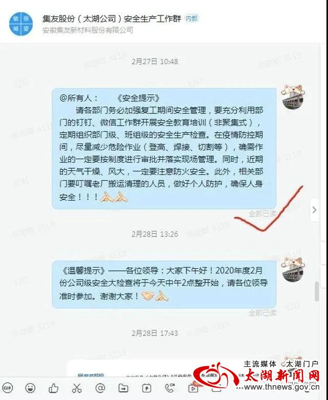 安徽集友新材料股份有限公司在疫情期间已复工450人,由于人员较多加之疫情期间不能开展聚集性活动,这给安全生产教育培训带来了很大的不便,该公司创新培训模式,利用手机办公软件“钉钉”开展员工安全教育培训,公司安环部负责人经常性在“钉钉”上发布一些安全培训PPT、警示教育片、安全提醒告知等信息供员工学习,并通过软件后台检查员工阅读学习情况,发现有员工未学习的,立即提醒员工及时阅读学习。同时还通过微信工作群和室外宣传栏发布、张贴上级有关安全生产工作要求和安全警示信息。该公司多种形式累计开展安全教育培训1000余人次,切实增强了员工在疫情防控期间的安全生产意识。