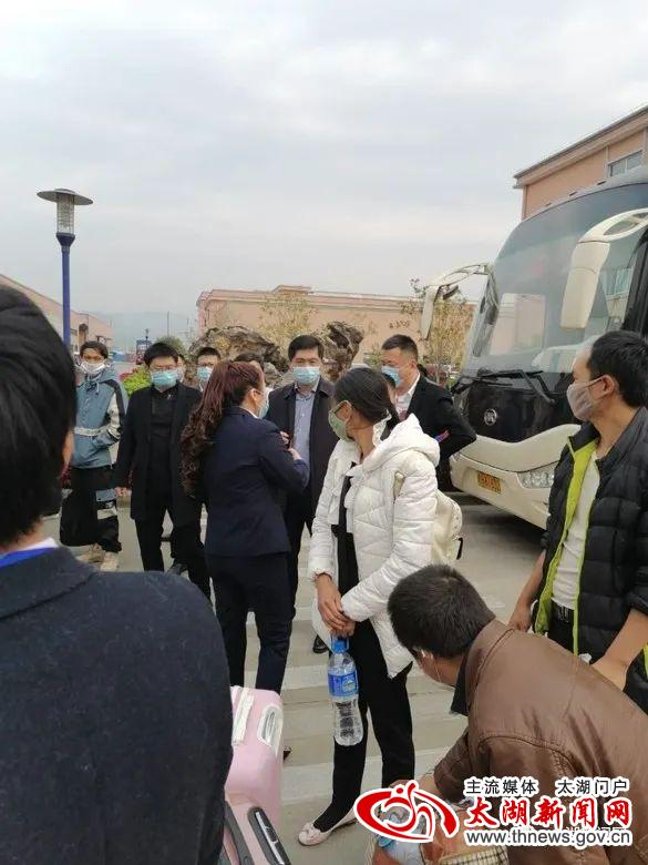 上午9点多,一辆车身悬挂着“众志成城、防疫护健康、复工保民生”条幅的大巴车缓缓驶出太湖高速路口收费站进入我县。随着最后一名务工人员走下大巴,完成身份核对、体温测量、口罩领取,首批28名务工人员安全抵达宏宇五洲。