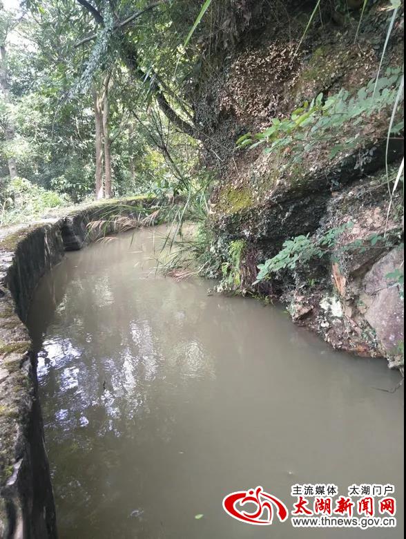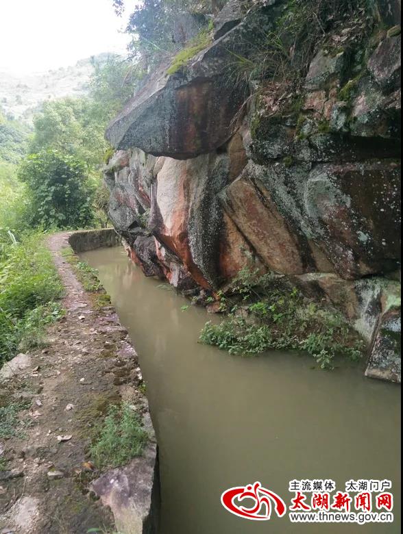 跟随当年参与水渠建设的见证者谢和平老人的指引,记者有幸来到该村孙湾组下岭宕山的半山腰。穿越一片密林,一条约2米宽的水渠映入眼帘,满渠清水静流,不急不缓。水渠一边紧贴绝壁,另一边是石块垒起的两米高、80厘米宽的渠堤,耸立于深渊之上。走上窄窄的渠堤,胆颤心惊,在前方引路的谢和平老人也放慢脚步,边走边讲述着那段艰苦奋斗的修渠岁月。