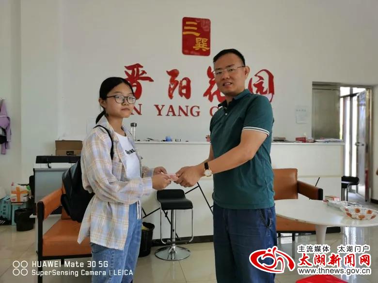 8月26日,太湖三巽置业有限公司总经理汪大海将5000元助学款亲手交给今年考取中国人民大学的胡子欣手上,助力胡子欣园大学梦。