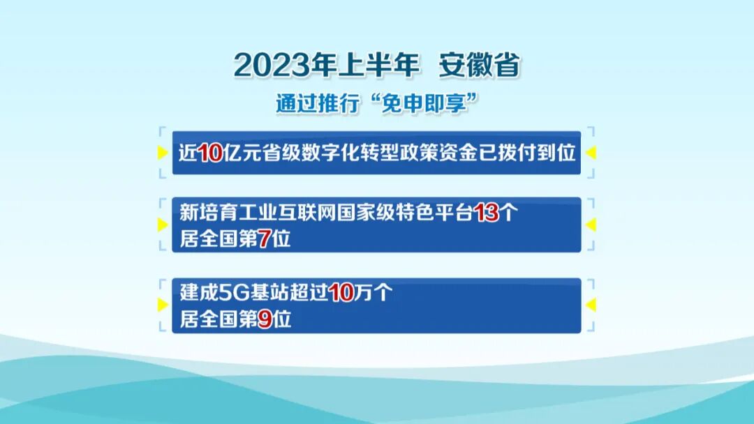 为推进智能制造取得更好进展,安徽16个市均已成立工业互联网发展专项工作组,并配套出台了专项规划和支持政策。今年上半年,通过推行“免申即享”,全省近10亿元省级数字化转型政策资金已拨付到位;全省新培育工业互联网国家级特色平台13个,居全国第7位;建成5G基站超过10万个,居全国第9位。